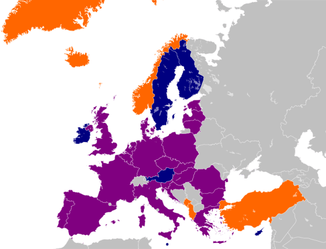Map showing the European membership of NATO and the EU demonstrating the EU – NATO Discrepancy: member of both in purple, EU member only in blue, NATO member only in orange. Map: Joebloggsy, Wikipedia